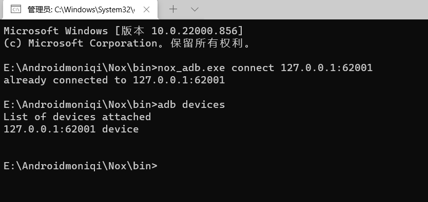 nox_adb.exe connect 127.0.0.1:62001即可以连接到adb,或者是adb connect 127.0.0.1:62001
