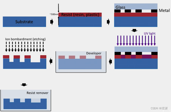 先在基板(最终想要的纳米柱材料)上旋一层光刻胶,然后制作一个上面蒸镀有金属图案的玻璃板,金属图案即为下方想要制作的纳米柱图案,然后光刻,没有金属覆盖的光刻胶会被紫外光损坏,放到显影液后,这部分胶就被冲走了,只剩下被金属保护好的胶,这时胶的图案就是想要的纳米柱的图案,然后将带有胶的基板整体往下刻蚀,被胶保护住的基板就不会有什么高度的变化,其余部分整体下降,如此,被胶保护的部分就形成了最终的纳米柱。