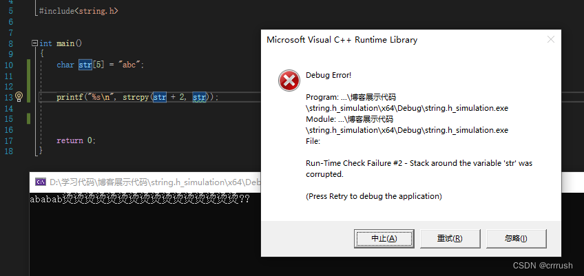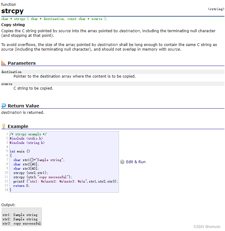 函数有两个char*类型参数,名字也很清晰,根据Parameters栏上的解释,一个是复制来源,一个是复制目标,函数返回一个char*的值,根据Return value栏上的解释,返回复制来源内容的目标字符串,也就是destination。而根据具体使用说明,该函数功能是将来源字符串的内容复制到目标字符串且包括终止标识符'\0',并且为了避免越界访问,目标字符串的长度必须长或等于来源字符串的长度(当然,这里计算长度也将’\0'计入在内)。除此之外,来源字符串的空间和目标字符串的空间不能重叠,这是一个重点,也由此看出这个函数是直接一个一个地址拷贝而不是预先拷贝整份数据用一个临时变量保存再拷贝到目标地址。(下图为使用重叠空间出现的错误,明显已经越界访问并且出现死循环了)