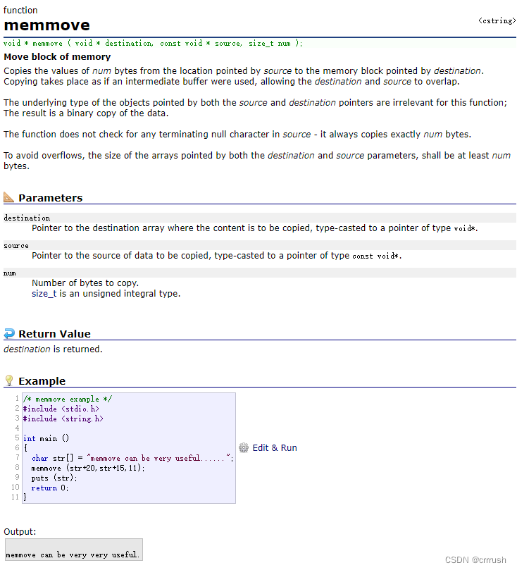 函数参数和返回值的设置意图和memcpy基本相同,唯一一点不同的是不要求两个指针指向的空间不能重叠,相应的,这个函数的功能与memcpy其实也基本相同,但是能处理两个指针指向空间重叠的情况。但是,虽然上文说memcpy不能处理空间重叠的情况,但是其实在有些编译器上是可以做到的,比如笔者用的vs编译器。这是由于研发编译器的程序员自行优化的,在这种情况下,memcpy和memmove的功能其实相差无几了。