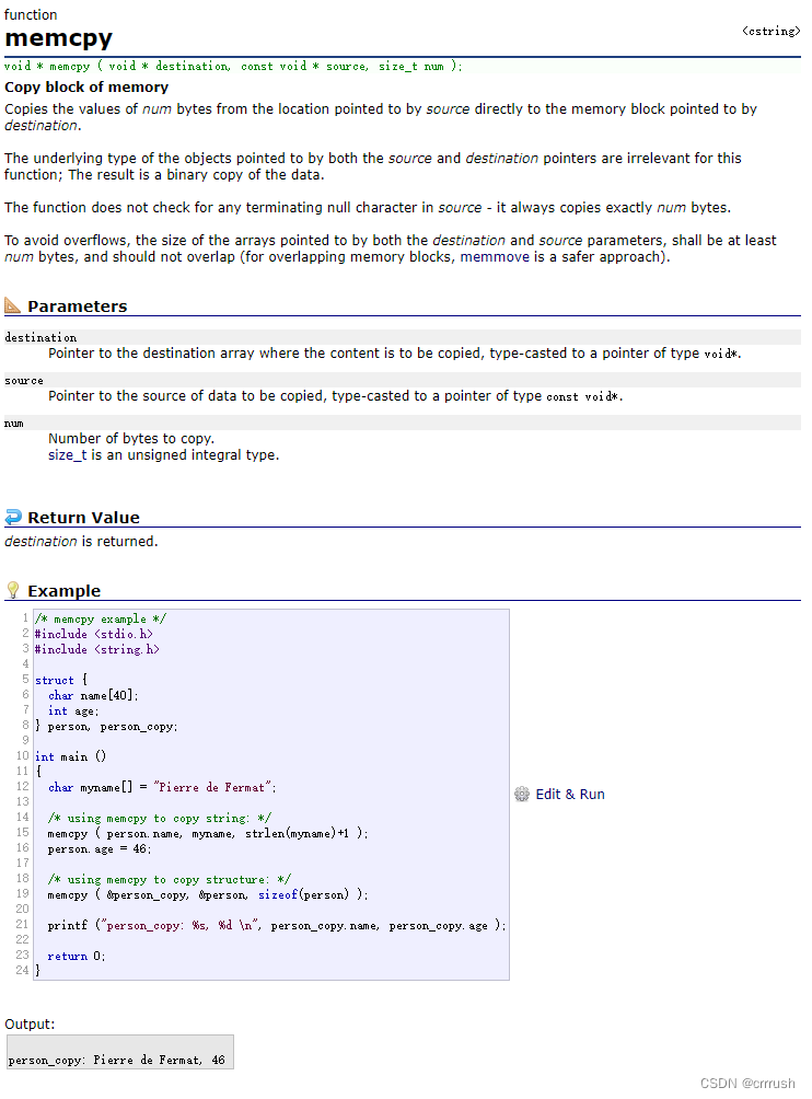 函数参数有三个,void*的指针,const void*的指针以及size_t类型的值,其中,destination指向存放复制内容的地址,source指向被复制内容的空间,num的值被复制内容所占的空间大小,单位是字节。 函数的功能是从source指向空间复制num个字节的内容到destination指向的空间,并且这个函数因为是一块一块字节的复制空间上的内容,所以并不考虑这两个指针参数实际的类型关系。这个函数是固定操作num个字节的空间的,不会检测终止标识符。同样的,为了避免越界,这两个指针所指向的空间必须多于num个字节,并且两块空间不能有重叠。函数最终会返回一个void*的指针,指向复制完成的内容,也就是destination指向的空间,使用时需自己进行类型转换。