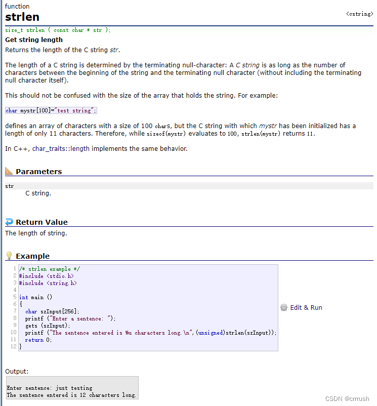 可以看到在strlen的下方是函数的声明,再下方的一大段英文是strlen具体使用规则,功能解释,使用说明,下方的几栏算是对该段英文的摘要,补充说明或者举例说明,parameters栏即参数说明,return value栏为返回值说明,剩下的那个自然是举例说明。