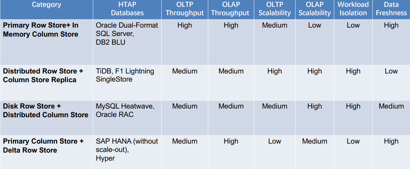 - HTAP Databases:分享最新的 HTAP 数据库技术,总结它们主要的应用场景与优缺点,并根据存储架构对它们进行分类。