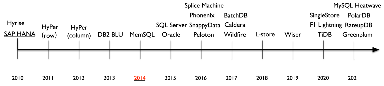 - 第一阶段(2010-2014):HTAP 数据库主要是采用主列存(primary column store)的方式。如SAP HANA、HyPer、DB2和BLU等。