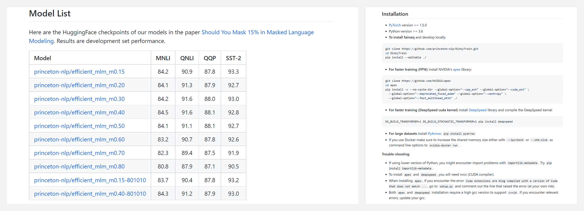 普林斯顿 NLP 的预训练库,是基于 fairseq 与 DeepSpeed 内核的整合,提供了一个用于高效训练掩码语言模型(MLM)的库。