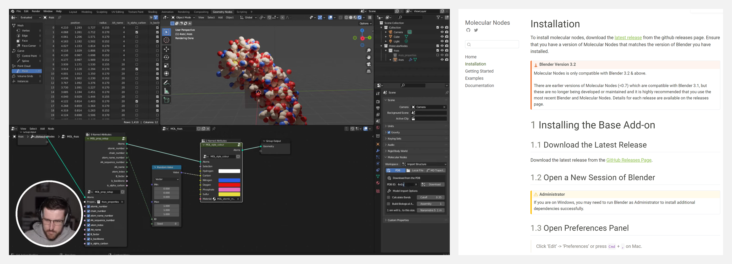 Blender 的 Geometry Nodes 为程序性建模和动画提供了一个强大的接口。目前,它在读取任何类型的结构化数据文件作为输入方面的能力是有限的,非三维网格。Molecular Nodes 提供了一个接口,可以将.pdb和其他类型的文件转换为Geometry Nodes可以使用的网格,从而弥补了这个差距。