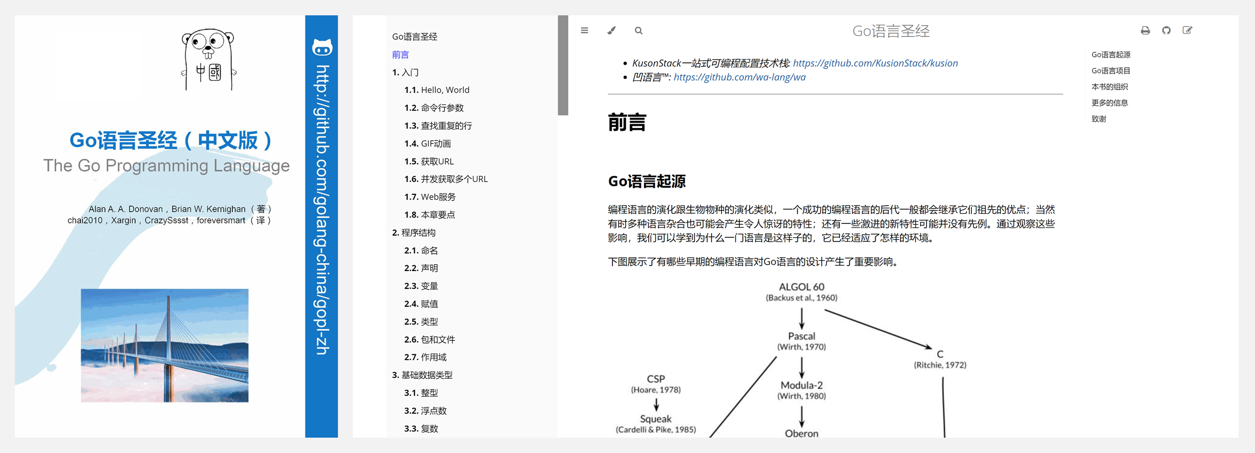 在 Go 语言2009年正式发布约5年之后,由Go语言核心团队成员 Alan A. A. Donovan 和 Brian W. Kernighan 合作编写了Go语言方面的经典教材《The Go Programming Language》。大部分Go语言核心团队的成员都参与了该书校对工作,因此该书的质量是可以完全放心的。中文版由中文Go语言社区的团队写作完成。