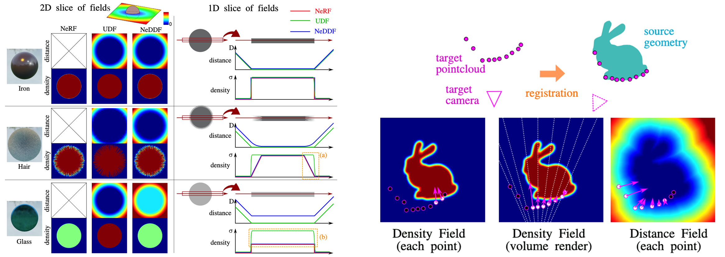 论文摘要:神经场在三维视觉任务中的成功现在已是不争的事实。在这一趋势下,一些旨在实现视觉定位(如SLAM)的方法被提出来,利用神经场来估计距离或密度场。然而,仅靠基于密度场的方法,如神经辐射场(NeRF),很难实现高的定位性能,因为它们在大多数空白区域没有提供密度梯度。另一方面,基于距离场的方法,如神经隐含表面(NeuS),在物体的表面形状方面有局限性。本文提出了神经密度-距离场(NeDDF),这是一种新型的三维表示方法,对距离场和密度场进行相互制约。我们将距离场表述扩展到没有明确边界表面的形状,如毛皮或烟雾,这使得距离场到密度场的明确转换成为可能。通过显式转换实现的一致的距离场和密度场能够对初始值具有鲁棒性并实现高质量的登记。此外,场之间的一致性允许从稀疏的点云中快速收敛。实验表明,NeDDF可以实现高的定位性能,同时在新的视图合成上提供与NeRF相当的结果。该代码可在https://github.com/ueda0319/neddf获取。