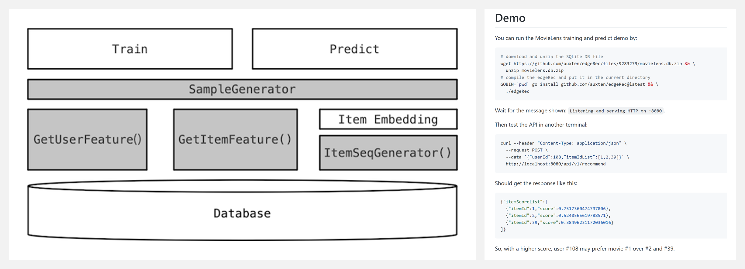 edgeRec 是一个基于深度学习的一体式推荐系统,可以在小型服务器或边缘设备上运行。核心技术为深度学习(Item2vec Embedding + MLP),覆盖特征工程 & 训练 & 预测功能。