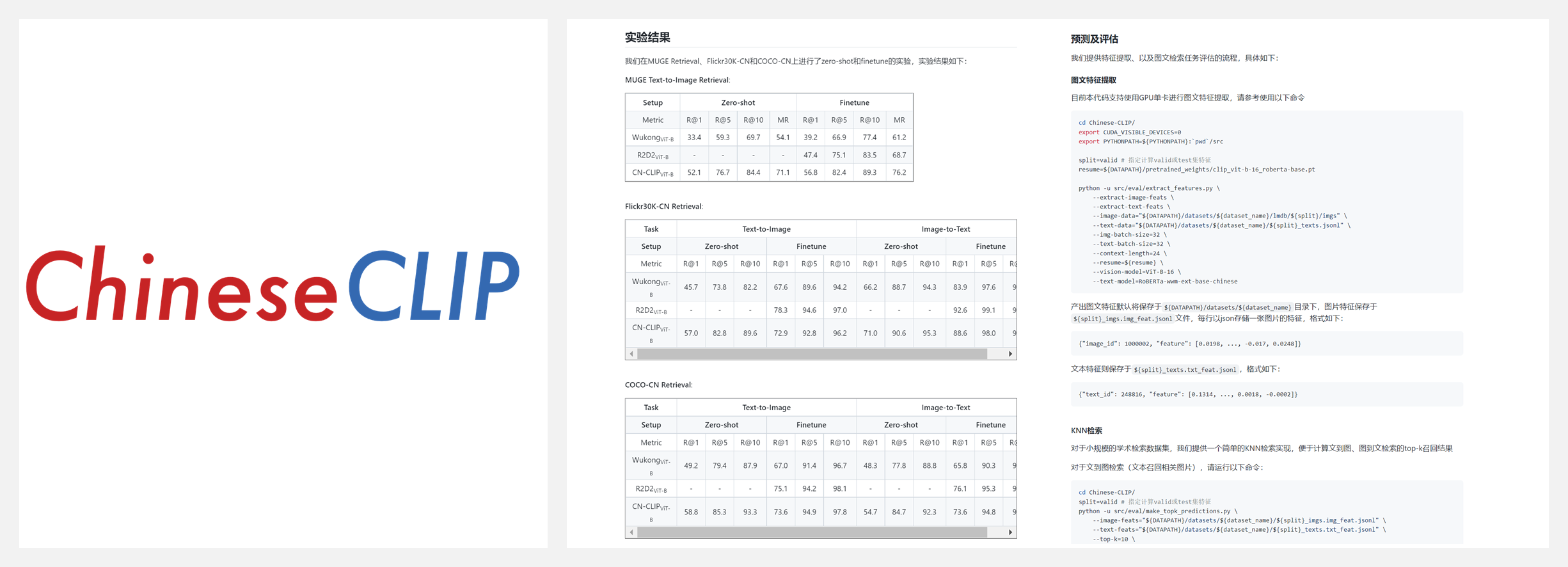 CLIP模型的中文版本项目,使用大规模中文数据进行训练(约2亿图文对),旨在帮助用户实现中文领域的跨模态检索、图像表示等。本项目代码基于『open_clip project』建设,并针对中文领域数据以及在中文数据上实现更好的效果做了优化。