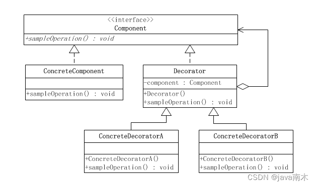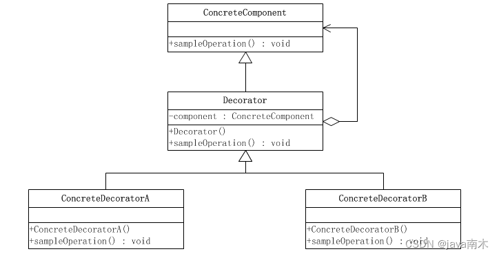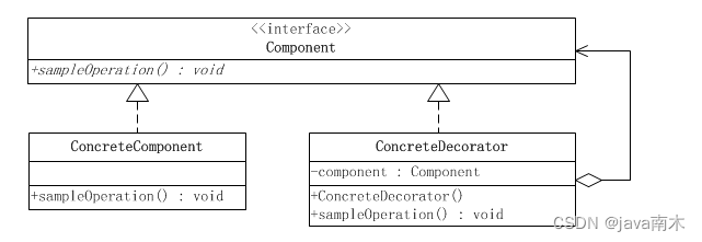 如果只有一个ConcreteComponent类,那么可以考虑去掉抽象的Component类(接口),把Decorator作为一个ConcreteComponent子类。如下图所示: