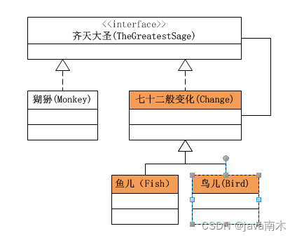 “大圣本尊”是ConcreteComponent类,而“鸟儿”、“鱼儿”是装饰类。要装饰的是“大圣本尊”,也即“猢狲”实例。