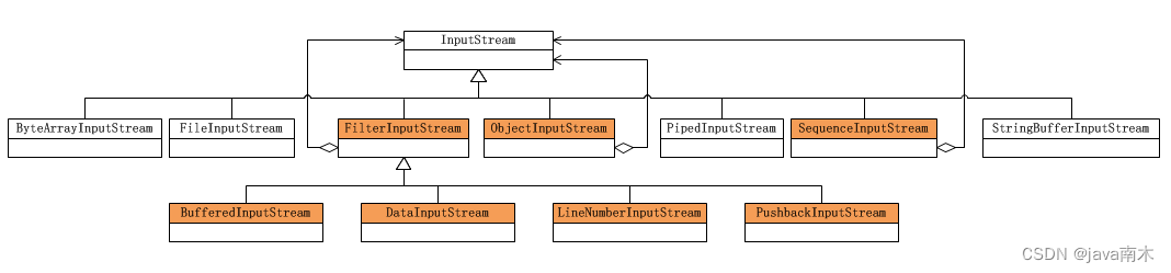 Java I/O库的对象结构图如下,由于Java I/O的对象众多,因此只画出InputStream的部分。