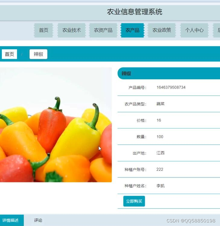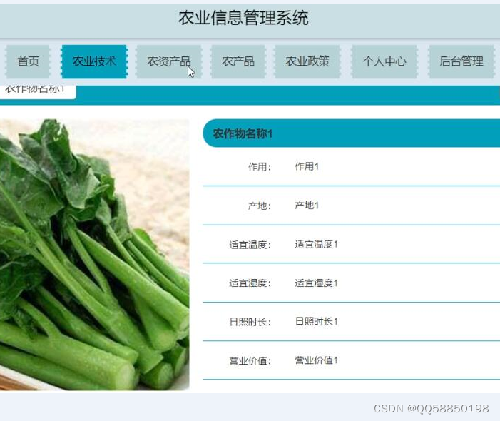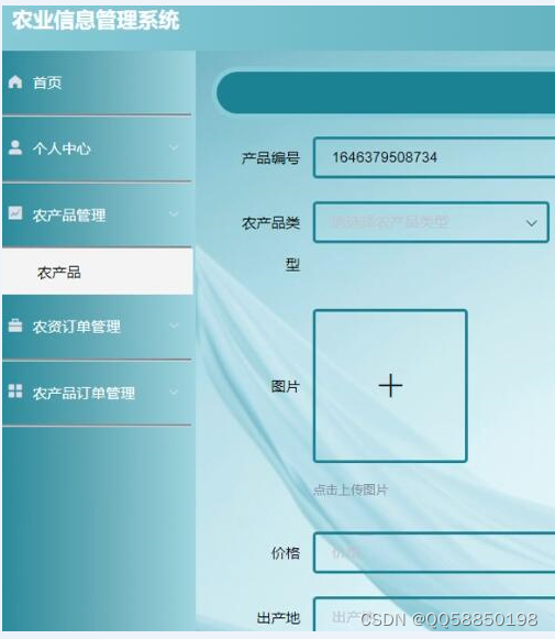 主要对首页,个人中心,用户管理,种植户管理,农业技术管理,农产品类型管理,农资类型管理,农资产品管理,农产品管理,农资订单管理,农产品订单管理,系统管理的实现。