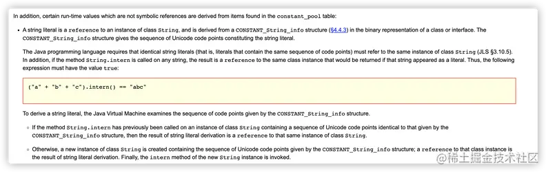 虚拟机规范还规定了,相同字符串常量必须指向同一个 String 类实例,此外,如果任意字符串调用 String.intern() 方法,其返回结果所指向的那个实例,必须和常量池指向的字符串实例完全相等。