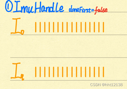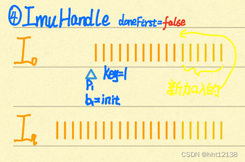 1.首先进入imuHandle,是向ImuOpt和imuQue两个队列里塞数据,此时doneFirst还是false(表示没有进行过优化),然后直接return掉