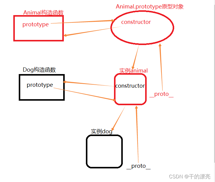 function Animal() { this.name = 'animal'; } Animal.prototype.getAnimalName = function () { console.log(this.name); }; function Dog() { this.name = 'dog'; } // 继承 Dog.prototype = new Animal() Dog.prototype = { getDogName() { console.log(this.name); }, someOtherMethod() { return false; } }; var d1 = new Dog(); d1.getAnimalName(); // 出错!在这段代码中,子类的原型在被赋值为 Animal 的实例后,又被一个对象字面量覆盖了。覆盖后的原型是一个 Object 的实例,而不再是 Animal 的实例。因此之前的原型链就断了。Dog和 Animal 之间也没有关系了。