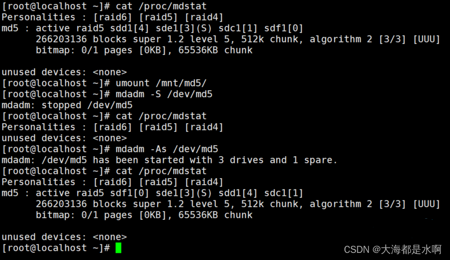 [root@localhost ~]# mdadm -S /dev/md5 #停止正在使用的md5