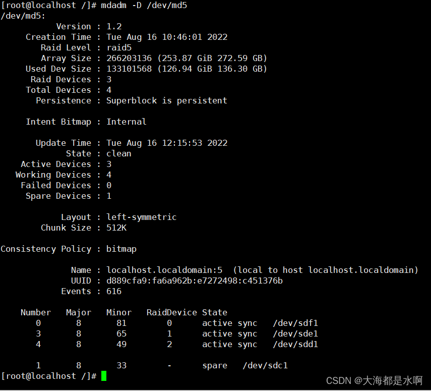 [[root@localhost ~]# mdadm -C -v /dev/md5 -l 5 -n 3 -x 1 /dev/sdc1 /dev/sdd1 /dev/sde1 /dev/sdf1