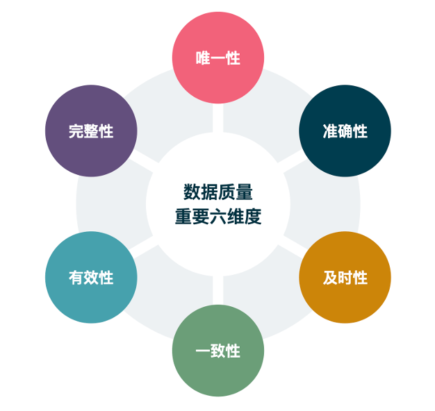 在评价企业数据质量的好坏时,首先需要定义评估的维度,通常较为重要的数据质量维度有以下6个: