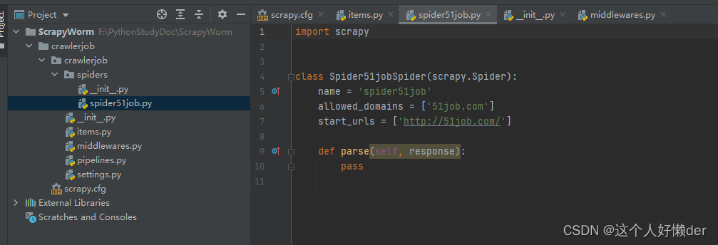 前面都是固定的,最后两个一个是爬虫名,一个是爬取范围,即访问的网站,在工程文件下可以看到新建了一个爬虫文件,爬虫逻辑都会在这个文件里写: