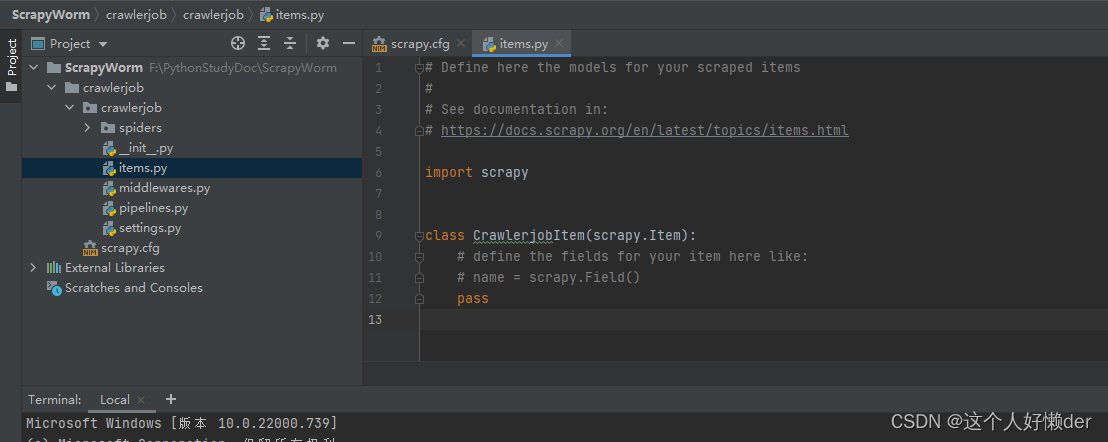 输入命令创建一个工程:scrapy startproject crawlerjob(最后的是工程名)