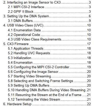 3.关于CX3的应用介绍,可以看它的AN,里面介绍了包括CX3的内部模块,工作机制,UVC协议,CX3的固件详解,如何搭硬件,太多了,因为我着急调试,也没看完,打算边调试边回头看,待整理~。另外还要参考CX3的规格书、技术参考手册(TRM)