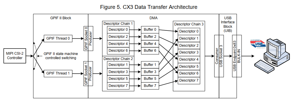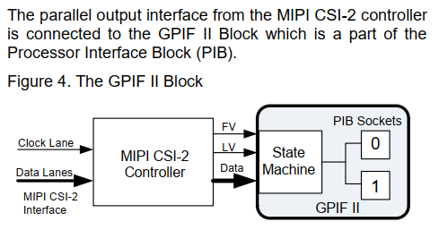 以下图中显示,GPIF II 主要是做状态机功能,PIB包含GPIF II和后面的sockets(给DMA用),sensor图像数据传过来时以串行mipi形式传输,然后CX3的MIPI CSI-2 Controller将其转换成并行数据传输给GPIF II