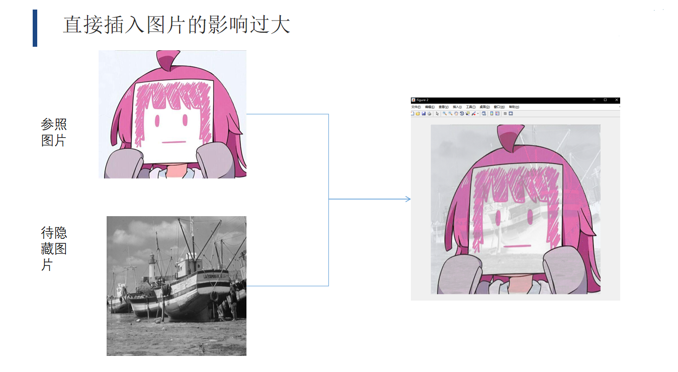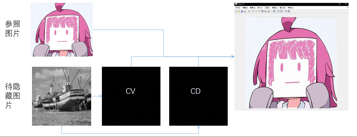 一个图像的主要信息在低频的位置,高频部分的信息较少,所以只需要将加密图片隐藏在参照图片的高频部分即可,并且对整个图像影响微乎其微。