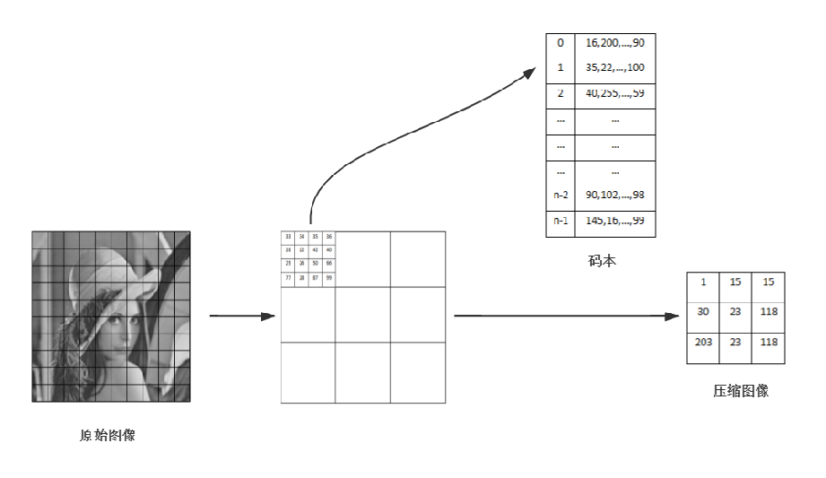 VQ具有压缩比例高、失真小的优点,所以在图像、语音、视频的压缩中被广泛使用,VQ的原理是将初始图像分割成一块块的小图像(向量),从被称作码书的码字集合中,找出对于每一块小图像所对应的失真最小的码字,用它在码书上的索引号替换小块图像。