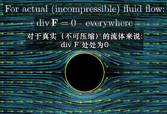 如果流体不可压缩,则其速度向量场必然处处散度为0(某点附近流入和流出的流体量相同)
