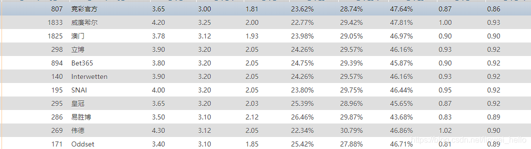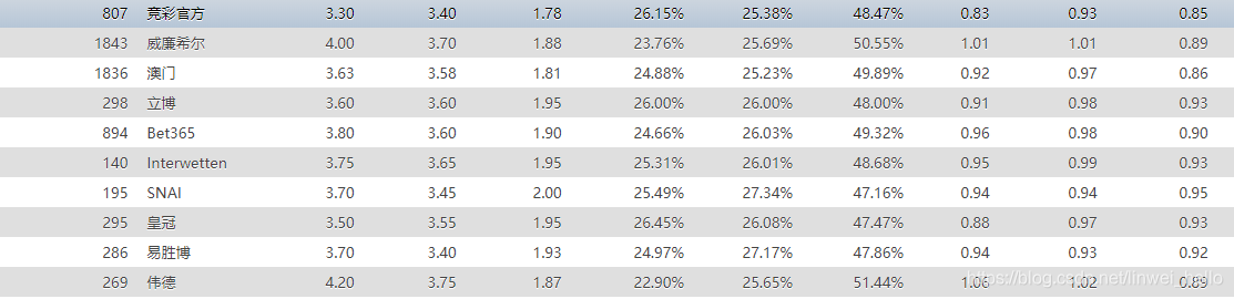 首先从mysql中可以看到竞菜官网与威廉希尔的欧赔初始赔率如下