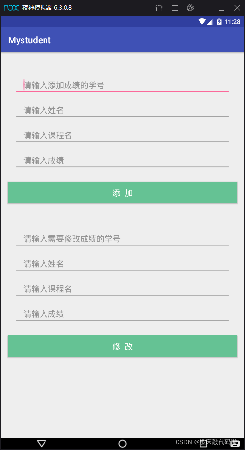 此功能为管理员为学生添加课程成绩,在此界面输入学生学号、姓名、课程名、成绩,即可添加学生课程成绩。