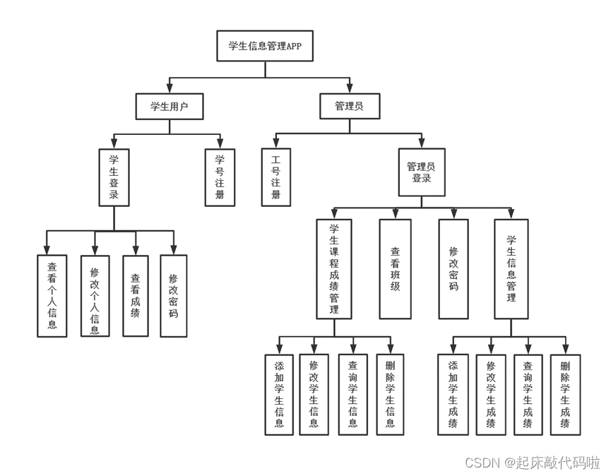 学生信息管理APP功能描述:本APP分为学生端功能和管理员端功能,学生端功能分为学号注册、学生登录、查看个人信息、修改个人信息、修改密码、查询课程成绩6个功能模块;管理员端分为工号注册,管理员登录、添加学生信息、修改学生信息、查询学生信息、删除学生信息、添加学生成绩、修改学生成绩、查询学生成绩、删除学生成绩、查看班级学生、修改密码12个功能模块。