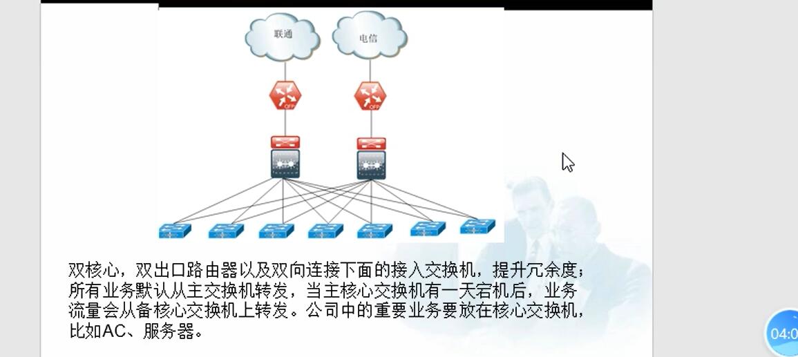 - 两核心交换机,业务流量优先从主核心交换机上传递,当核心宕机或者出现故障,业务流量会从备交换机上传递,(备交换机承接主交换机的任务)10-15s