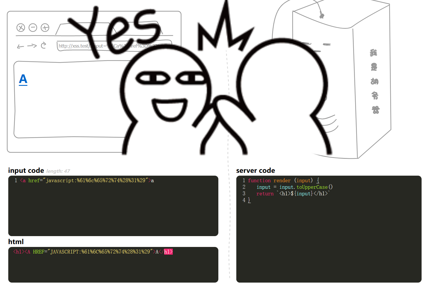 采用a标签,通过url编码绕过大写,点击 A这个链接进行触发