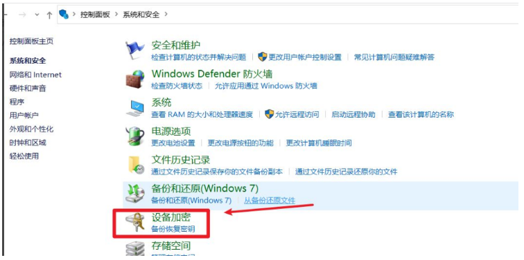 2.在系统和安全界面中,找到并打开设备加密选项。