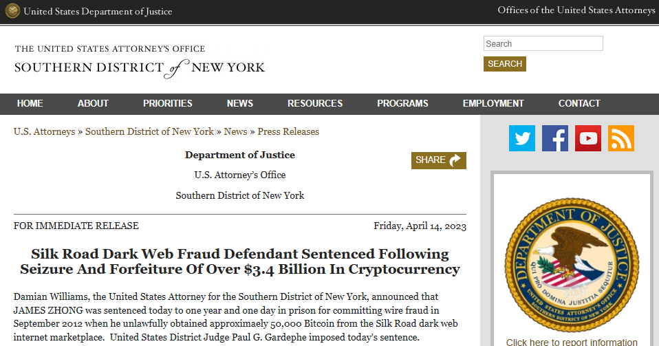 4月14日,美国纽约南区联邦检察官Damian Williams宣判,一位名为James Zhong的华裔黑客因2012年9月从丝绸之路暗网黑市非法获取约5万枚比特币而犯下电汇欺诈罪,判处其一年零一天监禁,并没收其价值超过34亿美元的加密货币。