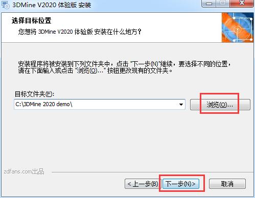 4.选择软件的安装位置,默认的是【C:\3DMine 2020 demo\】,单击【浏览】修改