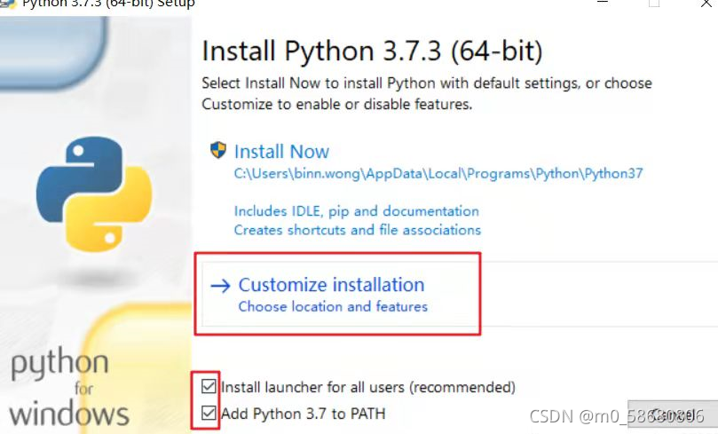 1.将下载完成的Python3.7.3安装包剪切到电脑桌面(不放桌面也可以,只是这样更方便),双击打开,然后将下方的两个选项框都打钩,再点击Customize installation进入下一步。