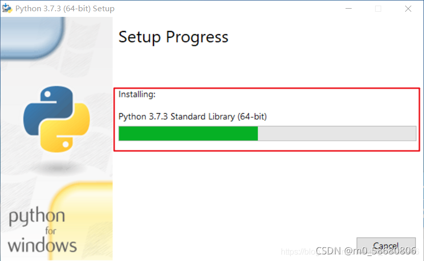 5.现在Python3.7.3开始安装,可以看到安装的进度条在读条,什么也不用做,稍等一会就安装完成了 。