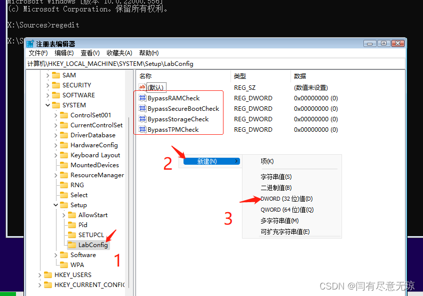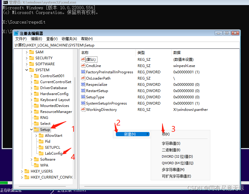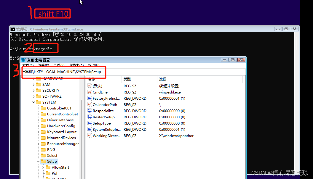 5、按shift F10弹出命令行窗口,然后输入regedit打开注册表,找到展开路径HKEY_LOCAL_MACHINE\SYSTEM\Setup