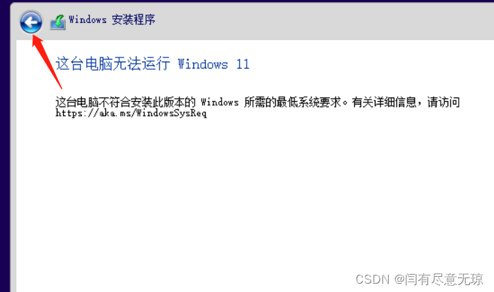 4、如图提示。win11系统需要TPM GPT 内存 存储一系列检查,这里绕过即可;