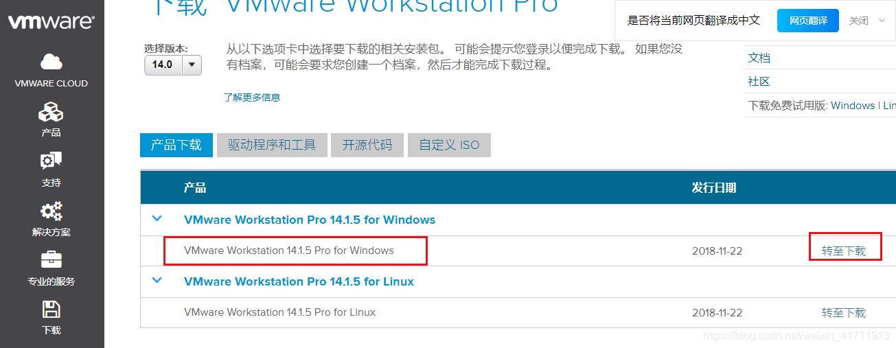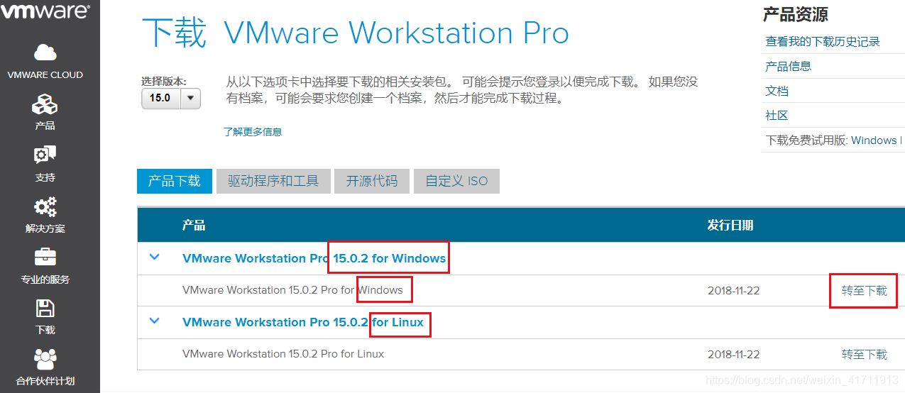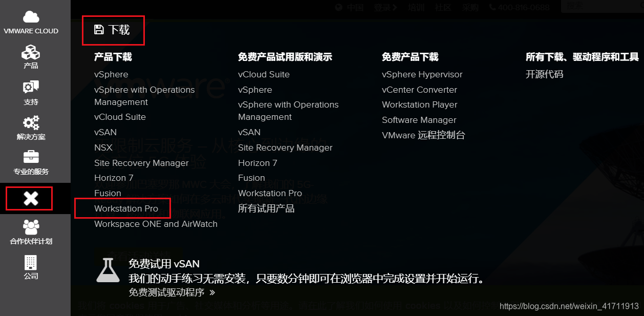 1.进入VMware官网: https://www.vmware.com/cn.html,点击左侧导航栏中的下载,再点击图中标记的Workstation Pro,如下图所示。