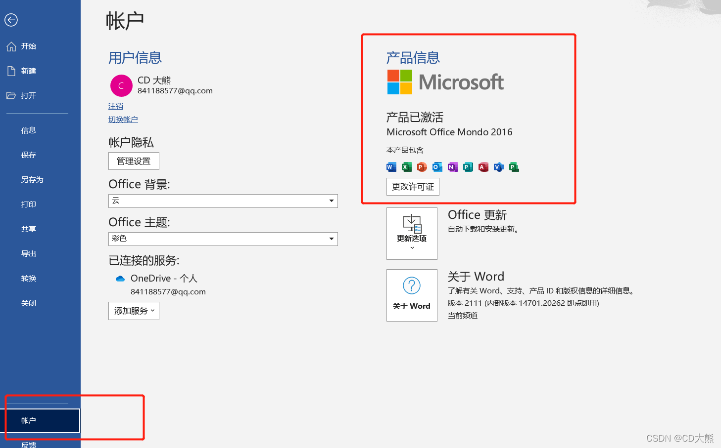 15.验证是否激活,打开安装的office,这里打开的是word,点击文件菜单,下方账户菜单,右侧如图所示,即为激活成功,尽情使用吧