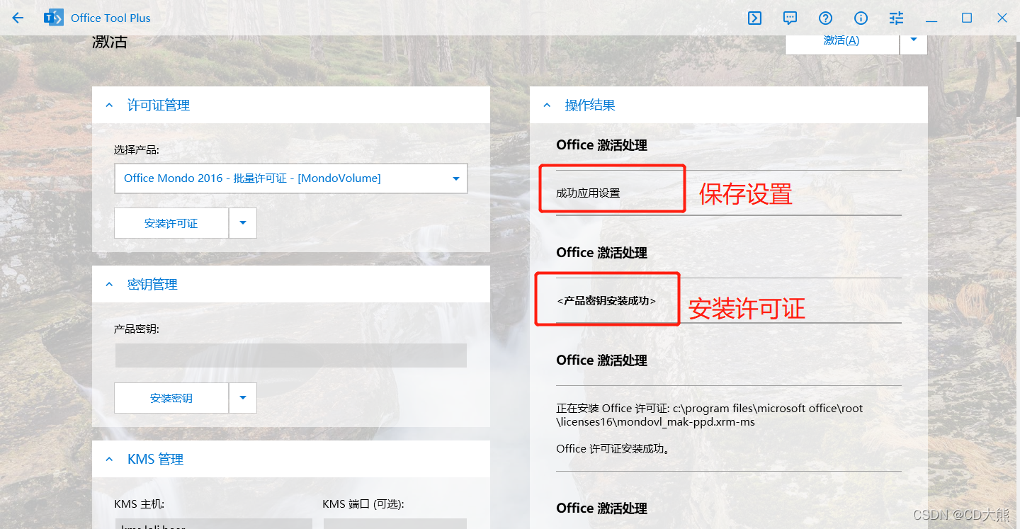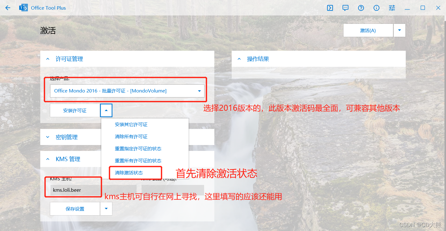 12.选择2016版本,此版本许可证最全面,可兼容其他版本,点击清楚激活状态,KMS主机输入:kms.loli.beer,这个不可用的话,在官网再找一个就行了,点击安装许可证,然后点击保存设置。