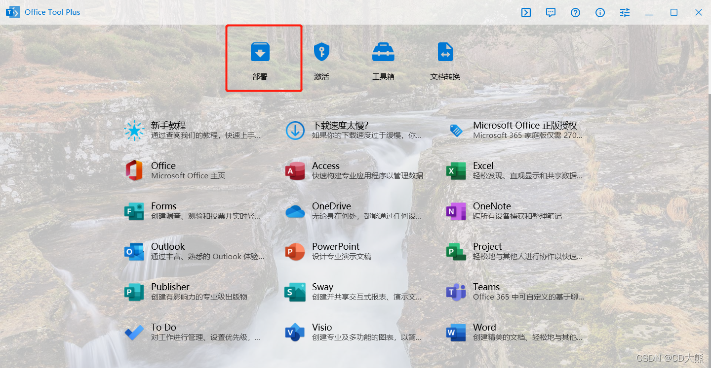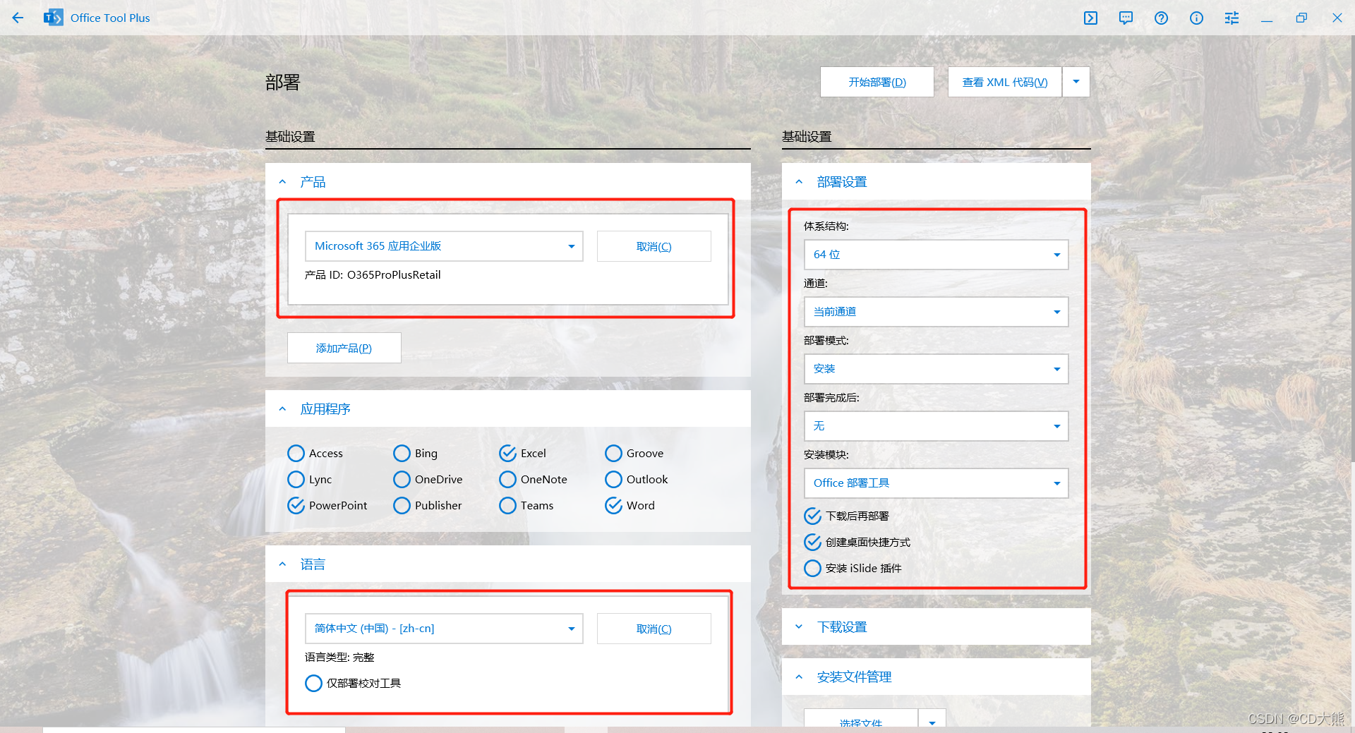 下方勾选办公三件套,其他的根据自己需求勾选,勾选哪个就会安装哪个,设置选择完后,点击右上角的开始部署