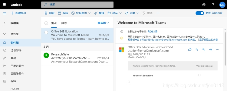 登录Office365后点击最左侧Outlook即可进入EDU邮箱(使用G·Suite所带EDU邮箱注册验证的Office365不提供邮箱),邮箱也可以使用桌面版或手机端Outlook应用程序登陆。进入Outlook后即可收发邮件,需要注意的是收件箱默认有“重点”和“其他”两个标签,系统会自动进行分类,有些邮件需要点“其他”标签才能看到。