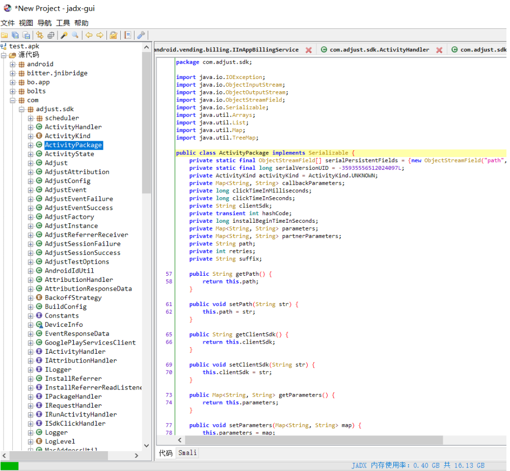 - 可以直接用jadx打开未加固的apk,打开(用FDex2从加固了的apk导出的)dex文件并查看和导出java源代码