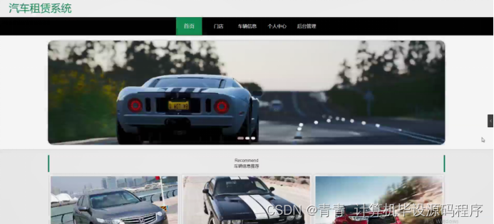 该界面是汽车租赁系统的首页,界面设置要求界面简洁明了、操作简单、兼容性好。在考虑设计界面时,首先要考虑界面标准化设计,其次是完善界面设计,但不要因对界面的美化使界面的操作变得复杂,用户可在此页面进行登录等操作,页面顶部导航条是各模块的入口。